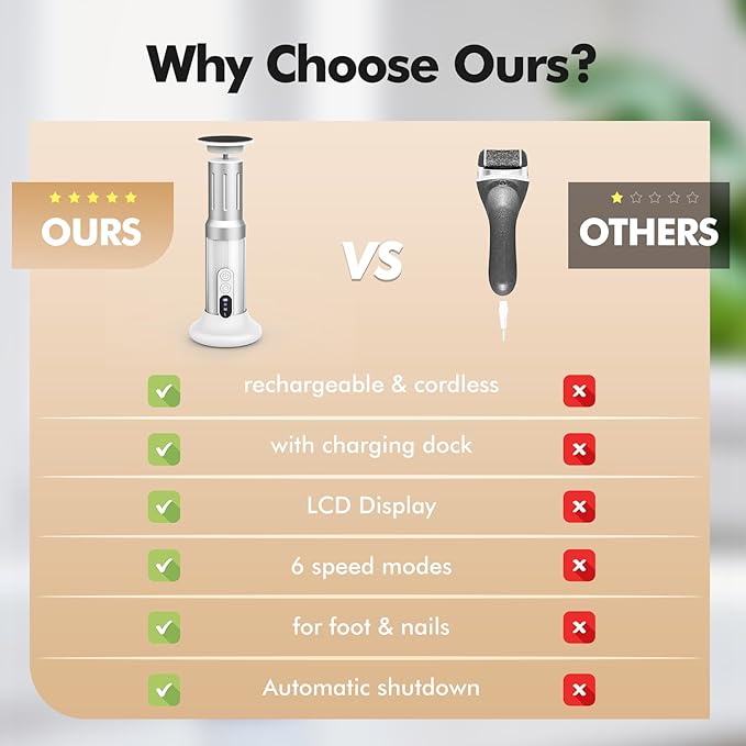 - 2 in 1 cordless electric foot filer and nail grinder: The electric callus remover heavy duty can be used for feet and nails. the electric filer comes with 10pcs flint paper and 10pcs fine sandpaper for feet, 10pcs flint nail sand circle and 10pcs fine sand circle for nails.