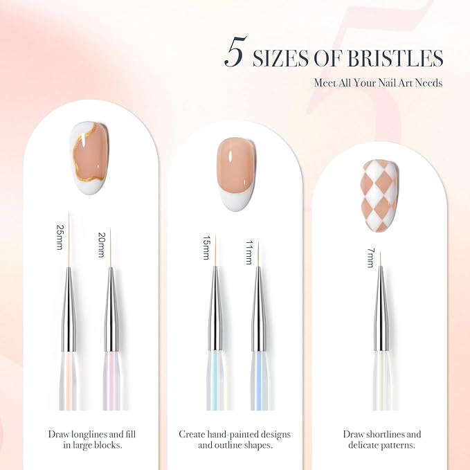 - 5 Sizes of Bristles: 5 different lengths - 7mm, 11mm, 15mm, 20mm, and 25mm. Perfect brush lengths to meet all your nail art needs
