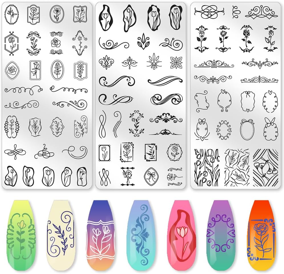 - Package Information: A total of 3 templates, 1 nail stamp and scraper, tulips, irregular borders, vintage floral, hollow designs patterns, randomly collocation, leading the nail fashion