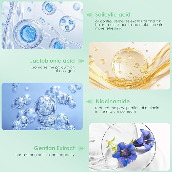 - Skin-Friendly Ingredients: Salicylic acid controls oil, removes excess oil, while lactobionic acid promotes collagen production, reduces melanin deposition, and provides antioxidant benefits