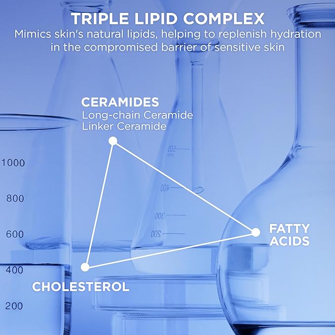 - TRIPLE LIPID COMPLEX: A powerful blend of ceramides, fatty acids, and cholesterol helps strengthen the skin barrier, locking in moisture and protecting against external aggressors.