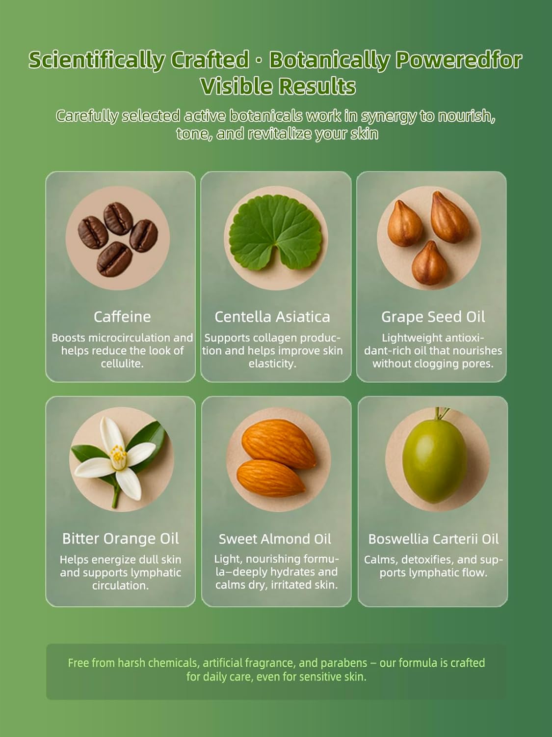 - 4-in-1 Botanical Formula β Smooth, Detox, Firm, Nourish: Powered by caffeine, centella asiatica, bitter orange oil, and a blend of nourishing carrier oils, this multi-action formula helps reduce cellulite, support lymphatic flow, tighten skin, and deeply hydrate.