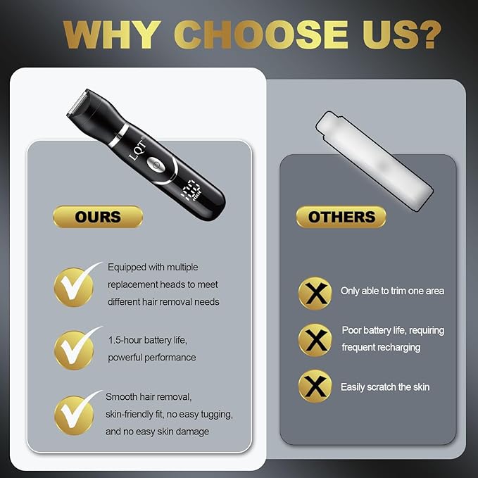 • 👙【Waterproof & Easy Cleaning】: The four heads of the LQT Pubic Shaver Bikini Trimmer Set are IPX7 compliant, allowing you to use it with shaving foam or dry. Its water-resistant feature makes cleaning a breeze—simply rinse under running water (please note that the body is not waterproof).