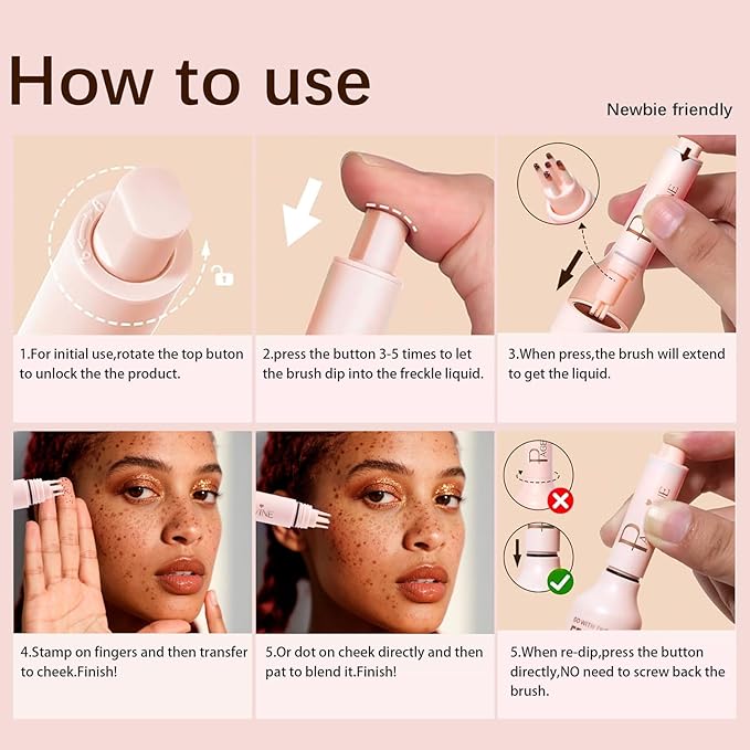- [Warm Tips]: Not Dry - Needs a Few Clicks to Start! - Think your freckle stamp is dry? It's not! For first-time use freckle pen & freckle stamp, Just twist to unlock and press the top button 3–5 times to let the liquid flow into the stamp head. Once the tip is wet, it’s ready to stamp cute freckles. Still unsure? Watch our demo video on this page to see exactly how to activate and use it!